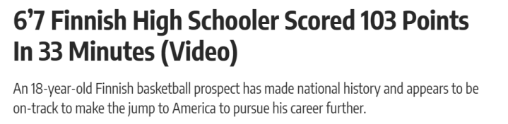 北京时间3月27日,据芬兰媒体YLE报道,WB黑豹队前锋南蒂-鲁希拉赫蒂在芬兰U19篮球联赛中单场狂砍103分,创下芬兰篮球史上单场最高得分纪录。